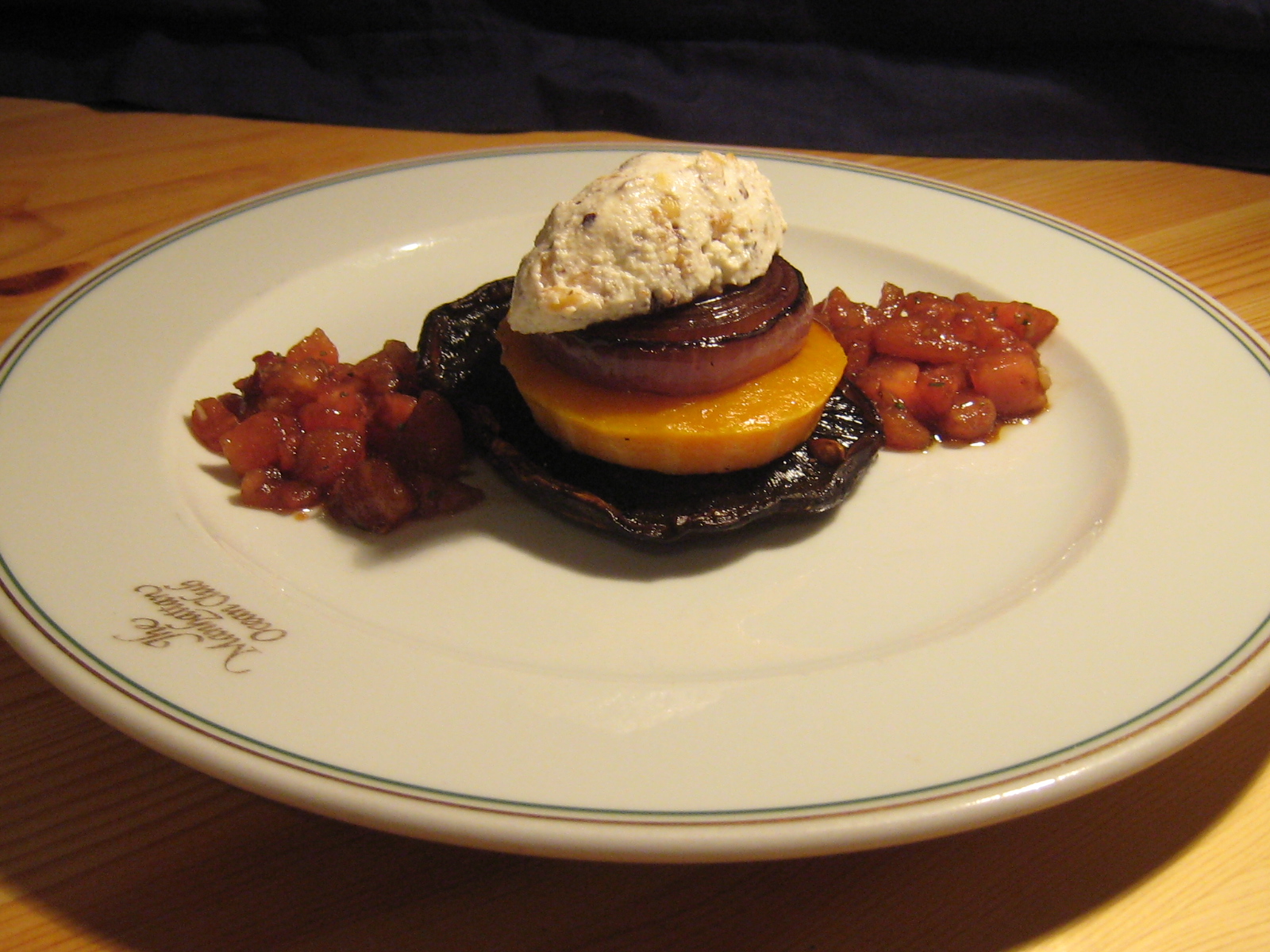 | Napoloean 1 Butternut Squash, cut into 1” width rounds 1 Red Onion 2 Large Portabella Caps ¾ Cup Ricotta Cheese ½ Cup Walnuts, toasted and finely chopped Salt ½ Tbsp Rosemary 3 Tbsp Olive Oil 1 Tbsp Butter | Tomato & Rosemary Tomatoes, emonder, 1/2 Clove Garlic, ½ Tbsp Rosemary, 1/s Tsp Ground Extra Virgin 2 Tbsp Balsamic |